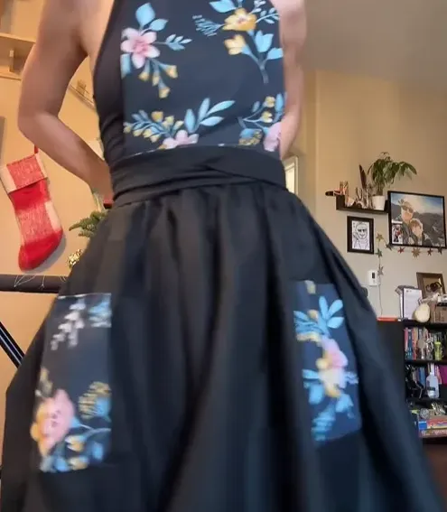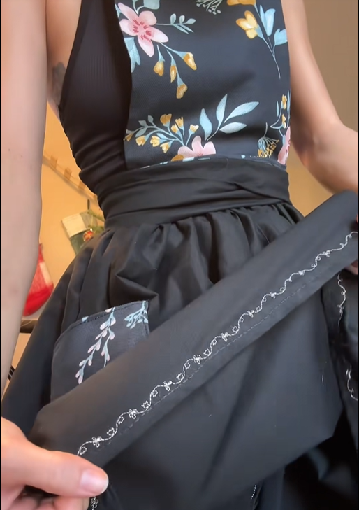 This beautifully tailored apron is more than just a kitchen accessory—it's a celebration of warmth, style, and tradition. Featuring a vibrant floral bodice paired with a full black skirt, it brings a charming retro flair to your everyday cooking or holiday hosting. With wide waist ties and a flattering halter neckline, it fits like a dream and moves gracefully with you.
